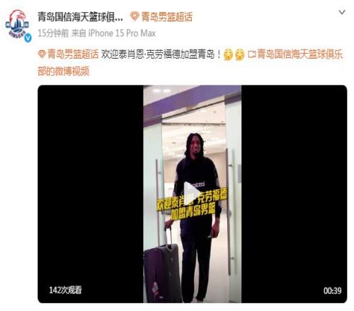 泰肖恩-克劳福德已经抵达,并且表示:“这是我第二次来中国,很感恩能获得这个机会,期待从每个人身上学习、让自己变得更好,迫不及待开始工作。”