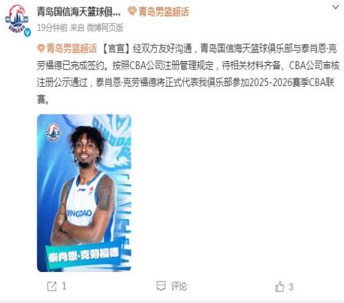 青岛男篮官方晒出泰肖恩-克劳福德加盟的海报,并且在公告写道:“经双方友好沟通,青岛国信海天篮球俱乐部与泰肖恩-克劳福德已完成签约。按照CBA公司注册管理规定,待相关材料齐备、CBA公司审核注册公示通过,泰肖恩-克劳福德将正式代表我俱乐部参加2025-2026赛季CBA联赛。