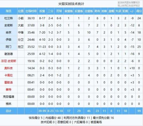 短暂休整后马刺延续追分势头,末段一波9-0实现反超,阿门隔扣科内特率队稳住局势,三节结束后火箭守住2分领先,末节决战,火箭进攻再次断电,文班连拿7分率队轰出13-2攻击波奠定胜局,最终火箭主场99-111不敌马刺,被对手完成16分大逆转。