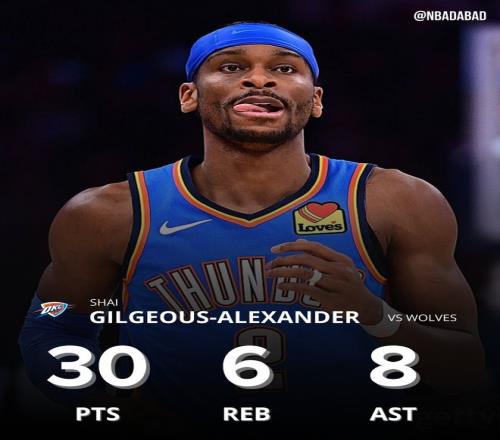 全场比赛SGA只打了31分钟,如果戴姆波特在末节还想一搏应该直接让SGA打,他的体能支撑41分钟不成问题吧?全场比赛18中12,三分2中1,拿到30分8助攻6篮板1抢断,命中率66.7%,真实命中率74.3%,正负值-22。