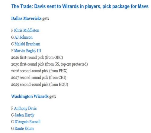 独行侠得到:米德尔顿、AJ-约翰逊、布兰纳姆、巴格利、2026年首轮签(来自雷霆)、2030年受保护首轮签(来自勇士,前20保护)、2026年次轮签(来自太阳)、2027年(来自公牛)和2029年次轮签(来自火箭)。