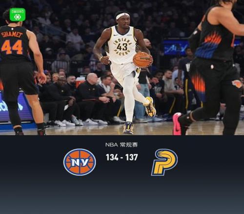加时赛尼克斯布伦森拿下5分,步行者昆顿-杰克逊拿下7分,最终尼克斯134-137不敌步行者