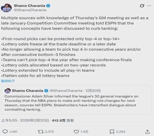 NBA官方计划推出多项新规打击故意摆烂:1、禁止球队连续两年获得前四顺位签;2、连续两年联盟倒数前三的球队不再获得高顺位签;3.打进分区决赛的球队,第二年不能获得前四顺位;4、根据两年的综合战绩,分配乐透抽签概率。