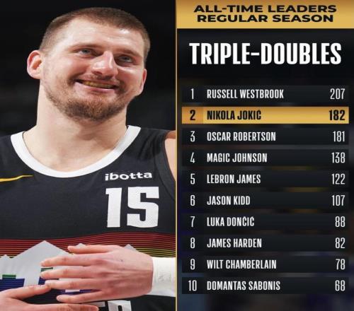 最新榜单里,威斯布鲁克常规赛三双 207次,约基奇 182次,差距是 25次。