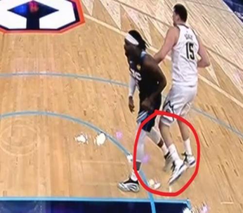 在一次回防的过程中,多尔特站在掘金半场罚球线位置缓慢移动,表面上盯着篮球的传递,实际上余光早已经瞄准了跑动中的约基奇。站在后者的行进路线上,多尔特在碰撞的瞬间扎下马步,左手手肘顺势顶向了约基奇的肋部。在约基奇向右躲闪的瞬间,多尔特右腿又向后一撩,将其直接扳倒。多机位的反复回放之下,多尔特这一套侵犯连招无处遁形。