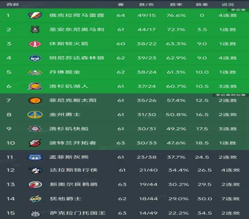 3-6名的球队分别是火箭、森林狼、掘金和湖人,他们之间最多相差1.5个胜场,火箭目前打了60场胜利,以63.3%的胜率暂列第三名,森林狼打了62场比赛,以39胜23负暂列第4名,近期收获4连胜,状态稳定。掘金以38胜24负暂列第5名,落后森林狼1个胜场,湖人落后掘金0.5个胜场,战绩是37胜24负。