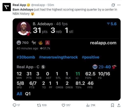 因为阿德巴约恐怖的首节表演,他也登上了全美第二热搜,第二节的他手感有所下滑,8中3+三分7中6拿到12分1篮板1抢断,半场已经拿到43分。