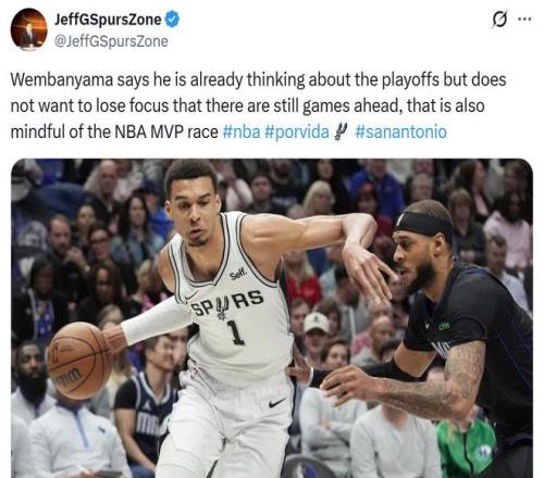赛后文班亚马就公开表示自己已经开始考虑季后赛了,但他不想因此而分心,毕竟还有比赛要打,同时自己也很关心MVP的归属。