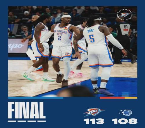 北京时间3月18日上午,NBA常规赛:雷霆113-108击败魔术,豪取9连胜。此役过后,雷霆战绩来到54胜15负,提前13场锁定季后赛。雷霆成为本赛季第一支杀进季后赛的球队。雷霆本赛季跟魔术交手两次,雷霆成功完成双杀!