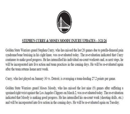 北京时间3月22日,过去一夜,一些球员的伤情更新,其中包括库里和特雷-杨。具体如下——