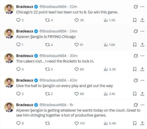 第三节申京更是单节6中6拿到12分6助攻5篮板,休媒:申京此役在球场上所向披靡,他想要什么就有什么。看到他接连打出多场高效的比赛真是太好了。火箭队在一度落后22分的情况下他一人扛着球队,申京正在烹饪公牛!