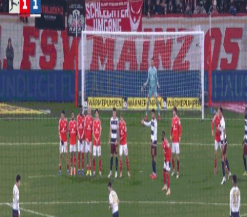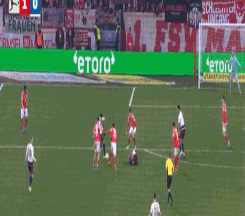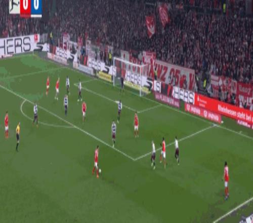 第45分钟,达科斯塔传中,阿米里凌空扫射破门,美因茨1-0