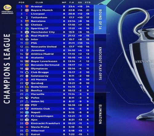 欧冠第一阶段联赛尘埃落定,阿森纳全胜创造新传奇