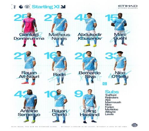 曼城首发:25-多纳鲁马、27-马特乌斯-努内斯、45-胡桑诺夫、15-格伊、21-艾特-努里、16-罗德里、20-伯纳多-席尔瓦、33-尼科-奥赖利、42-塞门约、10-谢尔基、9-哈兰德