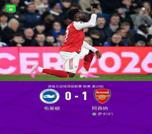 北京时间3月5日英格兰足球顶级联赛 第29轮,布莱顿主场对阵阿森纳。上半场加布里埃尔门线解围,萨卡兜射建功,赖斯任意球造险,下半场萨卡抽射造险,哈弗茨打门被扑。最终阿森纳1-0小胜布莱顿。