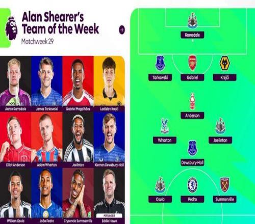 英超官方发布了阿兰-希勒评选的第29轮比赛最佳阵容,若昂-佩德罗领衔,加布里埃尔、奥苏拉等人在列。