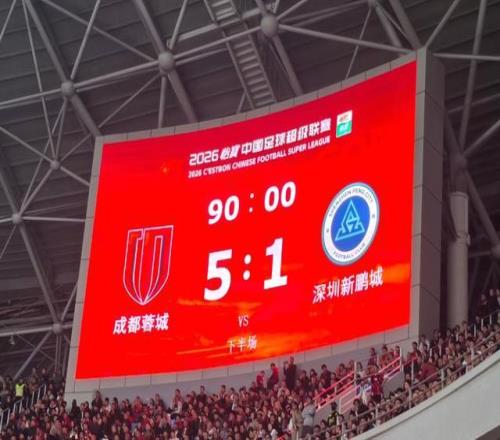 全场比赛结束,成都蓉城主场5-1大胜深圳新鹏城,在新赛季揭幕战豪取3分,登顶中超第一!