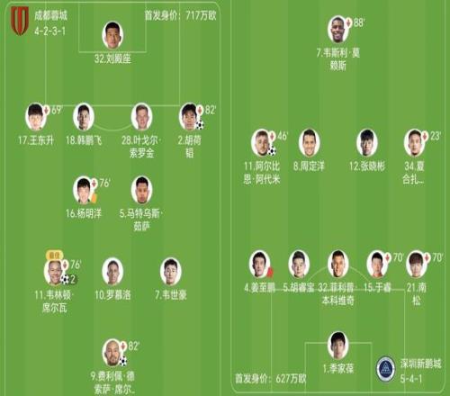 蓉城主教练约翰-阿洛伊西派上费利佩单箭头,身后是韦林顿-席尔瓦、罗慕洛和韦世豪。新鹏城主帅陈涛则派出韦斯利突前,阿代米、周定洋、本科维奇上阵。