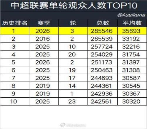 北京时间3月21日,中超第3轮所有比赛悉数战罢,根据德转管理员朱艺" rel="noopener noreferrer" target="_blank"> 的统计,本场比赛中超观众总人数达到285546人,场均观众人数为35693人,创造了中超单轮上座人数新纪录!此前纪录为2016赛季第2轮的265539人。
