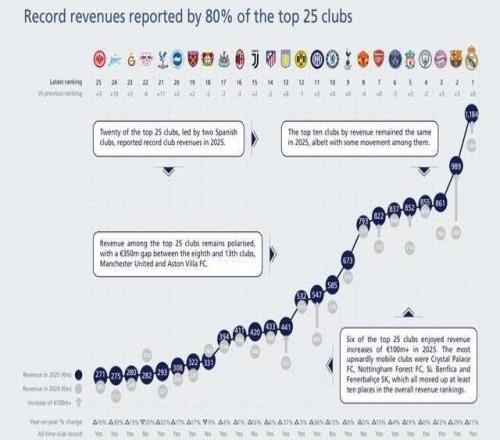 北京时间2月26日,欧足联官方发布了《2025俱乐部财务与投资格局报告》,其中列出了各俱乐部2025年度收入排行榜,...