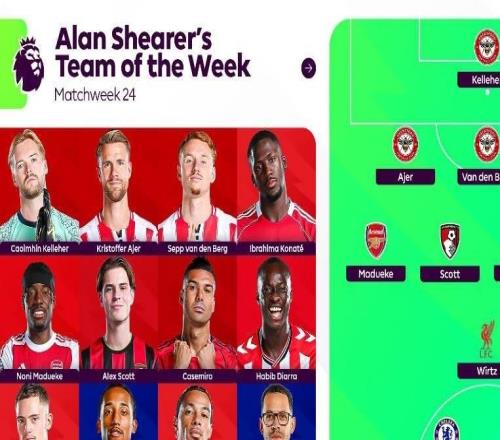 北京时间2月4日凌晨,英超官方晒出了阿兰-希勒评选的英超第24轮最佳阵容,其中,科纳特、马杜埃凯、维尔茨、卡塞...