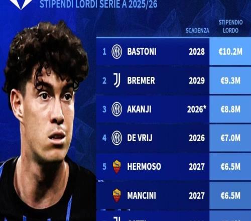 北京时间2月17日,德转统计出了2025-26赛季意甲税前工资最高10名中后卫,巴斯托尼以1020万欧元高居第一,布雷默93...