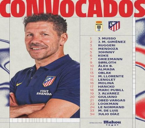 马竞客战奥维耶多名单:格子领衔,尼古拉斯、巴里奥斯仍伤缺