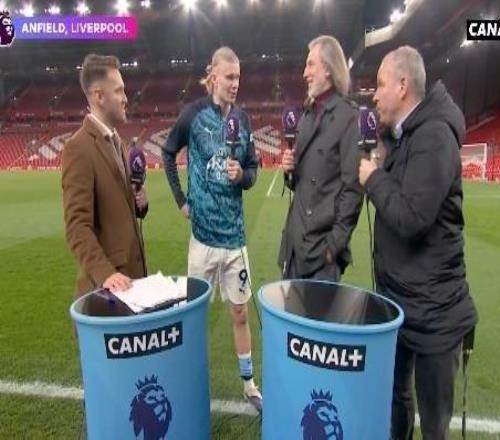 英超第25轮,曼城客场2-1战胜利物浦,曼城前锋哈兰德赛后接受了CANAL+体育的采访。祝贺你。这是一场意义重大的...