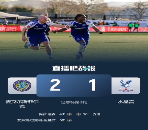 在今天晚上进行的足总杯第三轮比赛中,英格兰第六级别联赛球队麦克斯菲尔德主场2-1击败水晶宫,成功晋级。麦克...