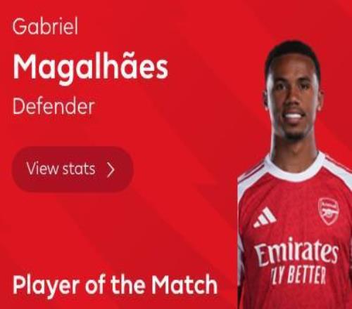 定海神针,加布里埃尔当选布莱顿vs阿森纳全场最佳球员